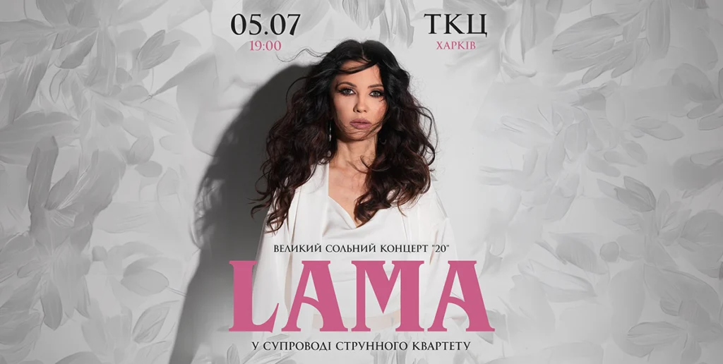 Авторка десятків хітів, які знає кожен: «Мені так треба», «Літак», «Моє серце», «Знаєш як болить», «Ангел», «Привіт, привіт», «Сильні люди» та інші. Її пісні роками очолюють радіоефіри, а альбоми отримували платиновий статус вже у перші тижні після релізу. Запрошуємо вас стати частиною цього вечора та відчути музику Lama наживо!