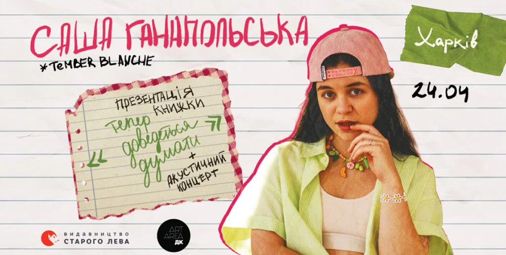Саша Ганапольська з гурту Tember Blanche презентує свою дебютну книгу «Тепер доведеться думати» у Харкові разом із акустичним концертом від зіркових гостей — персонажів повісті Ганни Польської та Лабра Дудлі!