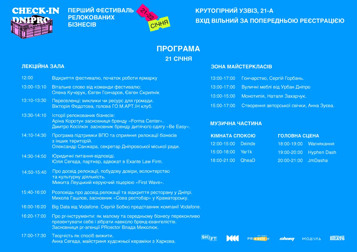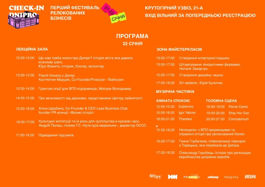 У Дніпрі вперше відбудеться фестиваль бізнес-проєктів, які переїхали з тимчасово окупованих територій. Він має назву Cheсk-in Dnipro та пройде 21 і 22 січня у дніпровському Центрі сучасної культури.