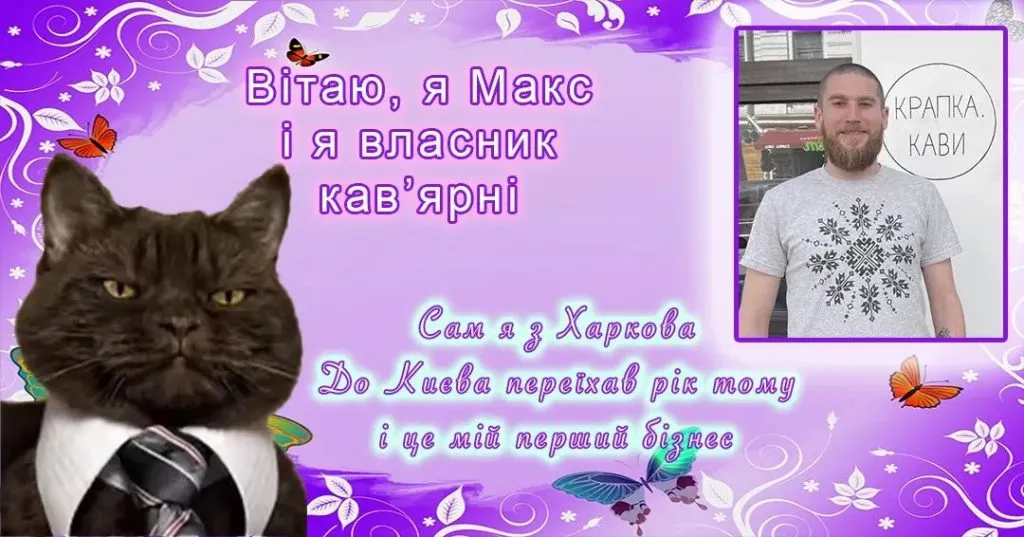 Макс (просив не називати прізвище) — підприємець із Харкова. Раніше він виготовляв кастомні футболки з українськими мемами під брендом «Ostogydlo» та розігрував їх у Twitter за донат на користь ЗСУ. Тепер Макс відкрив кав’ярню «Крапка.кави» на вулиці Софіївській, поруч із майданом Незалежності.