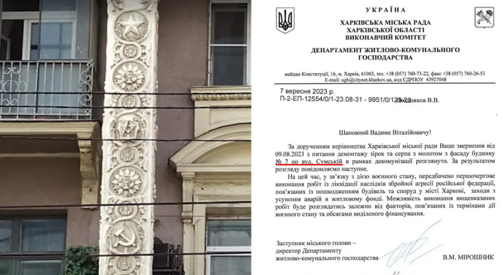 Харківська міська рада відповіла на запити засновника групи «Деколонізація.Україна» щодо радянської символіки у оздобленні будинків у центральній частині міста. Директор Департаменту ЖКГ Віталій Мирошник пояснив, що у першу чергу комунальники займаються пошкодженими через російські обстріли будинками.