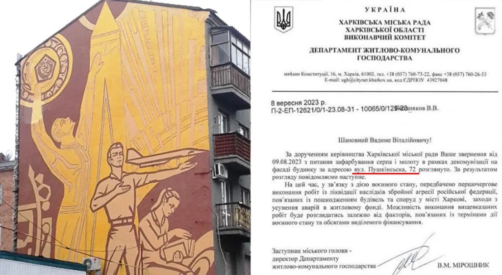 Запити деколонізаторів стосувалися великого сграфіто із гербом СРСР на стіні будинку по вулиці Пушкінській, а також ліпнини з серпами, молотами та радянськими зірками на Сумській. Зазначимо, що це стандартна відписка від харківської влади. У січні активісти отримували схожу відповідь щодо муралу із зображенням Сергєя Єсеніна.