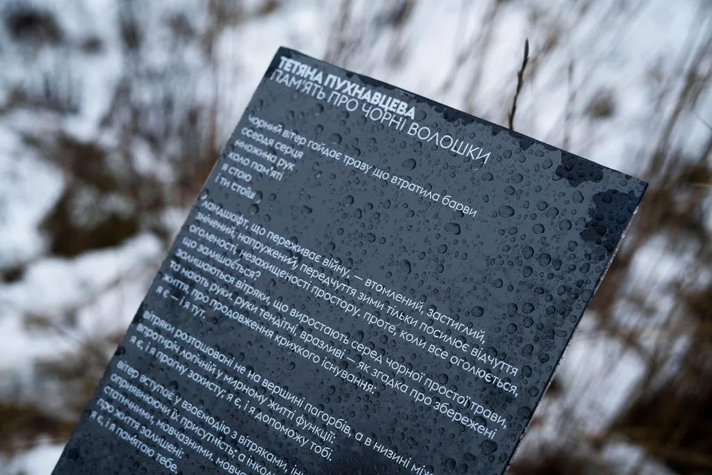 Вчора, 26 листопада, у Саржиному Яру просто неба відбулася виставка лендарт-симпозіуму «Простір покордоння». Проєкт має назву «Внутрішньо переміщений ландшафт» та простежує, як в умовах війни змінюється ландшафт, зв’язок між людьми та місцем, за якими механізмами він виникає та підтримується.