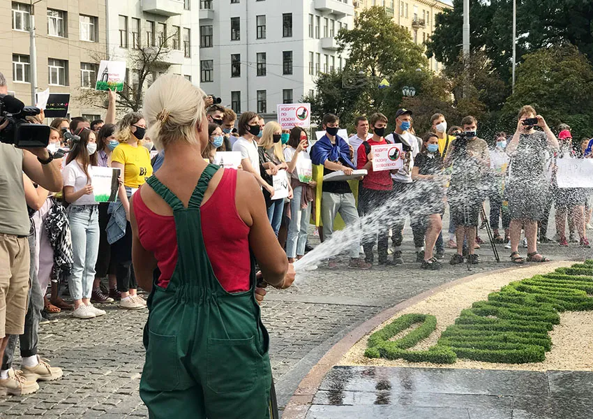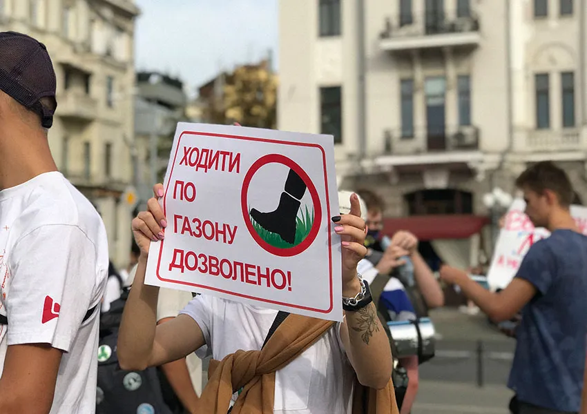 Газон біля пам’ятника, який обирають учасники та учасниці, виявився добряче политим. Попри це, організатори пропонують — за прикладом протестів у Білорусі — ходити по ньому босоніж. Значна частина протестувальників та протестувальниць так і вчиняє. Вони розгортають на землі ковдри та каремати, грають в «настолки», співають під гітару, читають, їдять піцу та просто спілкуються. За кільканадцять хвилин на вже политій ділянці вмикається поливна система, за яку хвилювалась охорона.