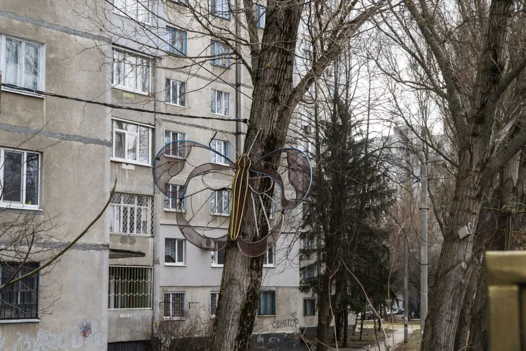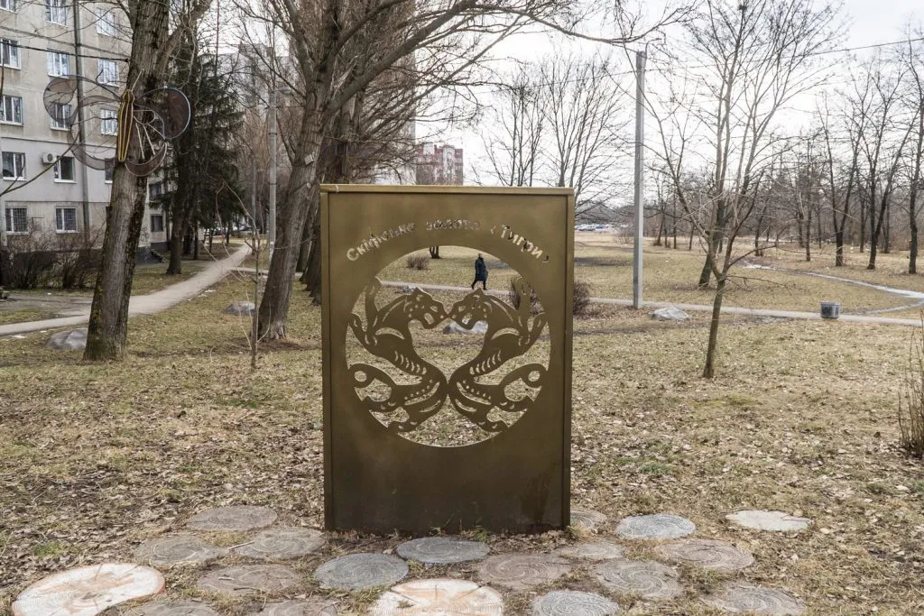 [Над скіфським золотом в гіллі дерева інопланетного вигляду — метелики. «Вони ще й світяться вночі!» — коментує Кирило. Тим часом ми підходимо до кованих фігур у вигляді тварин, що зображені в скіфському звіриному стилі. Сквер з такою тематикою відкрили тому, що Україна прагнула повернути скіфське золото з виставки у Нідерландах. У 2022 році це вдалось зробити. Спрацювала магія скверу? А ще цікаво, як ХТЗ тяжіє до давнини — стоунгендж, скіфи…]