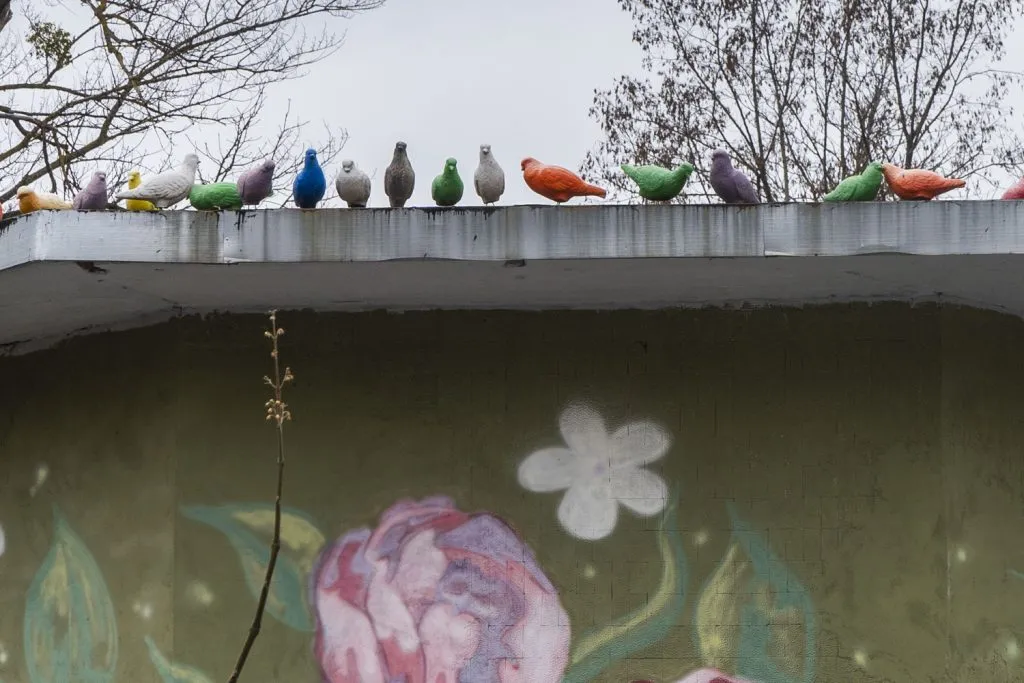 [Ця частина ХТЗ має особливий вайб. Низенькі будиночки, між якими — смарагдові галявини. Ми розглядаємо архітектурні прикраси будинків, проходимо повз парк «Зелений гай», який після реконструкції і до повномасштабної війни тимчасово став місцем зародження громадських ініціатив]