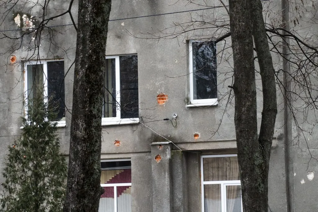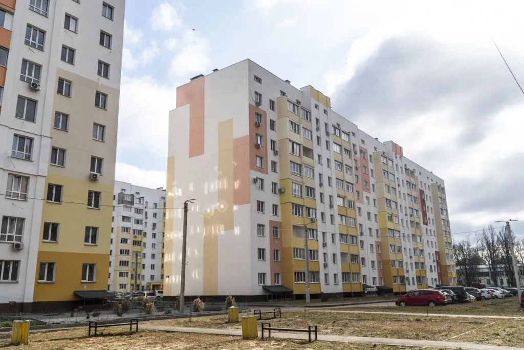 [Ми оглядаємо яскраві зелені будинки, в яких ще немає жильців, але вже є сліди прильотів]