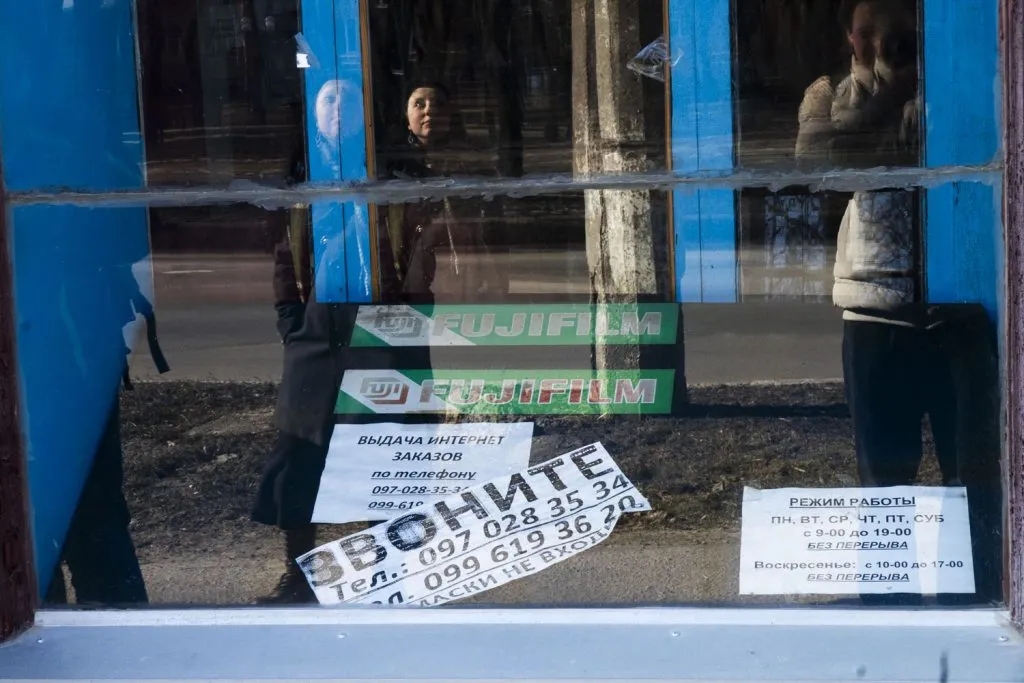 [Здається, тут важливо — показати, що ти «свій» через набір кодових фраз. А на вітрині фотоательє — шестизначний номер телефону. Таки ніхто тут вже давно не друкує фото і навіть не робить знімки на документи]