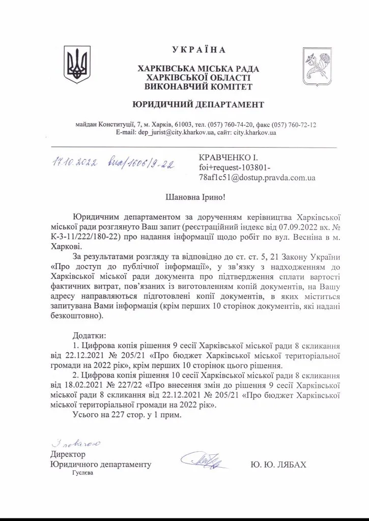 «Спочатку Юридичний департамент ХМР зажадав з мене 600 грн за відповідь. Це витрати на сканування документів (227 сторінок бюджету Харкова за 2022 рік). Коли я сплатила цю суму, мені надіслали пошкоджені файли, які неможливо прочитати, — розповідає Кравченко.