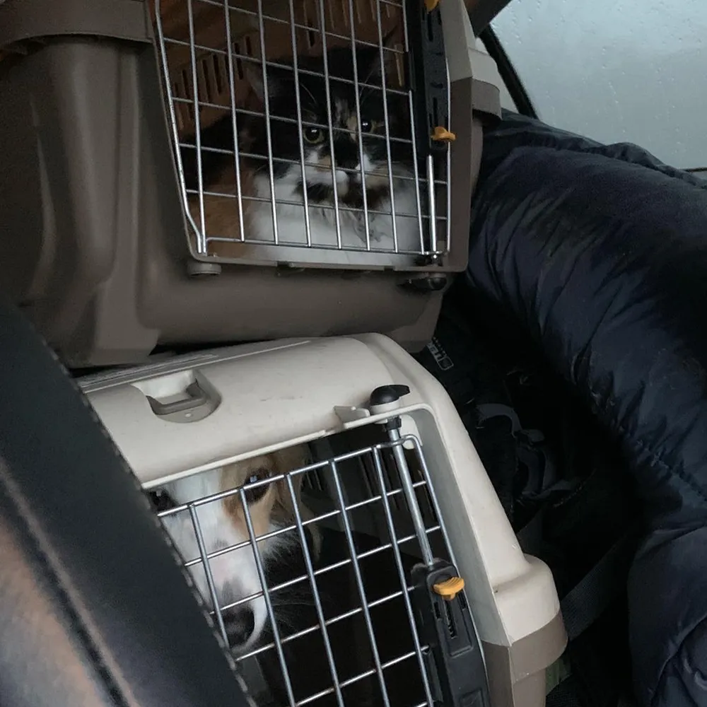 Поїхали, на жаль, не повним складом. Фоксі дуже боїться вибухів, погано переносить дорогу і в принципі ляклива собака, тому вирішили відвезти її у Красноград до мами чоловіка. Це Харківська область, але у ста кілометрах від Харкова: за весь час там збили лише пару ракет, і в цілому там дуже спокійно. Кішку Мікасу лишили з Фоксі, бо вони подружки, і так ми майже рік прожили окремо.