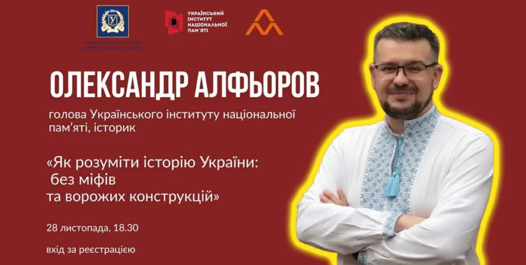 28 листопада відбудеться зустріч з головою Українського інституту національної пам’яті, істориком і блогером Олександром Алфьоровим. Темою зустрічі стане розуміння української історії без міфів та ворожих конструкцій.