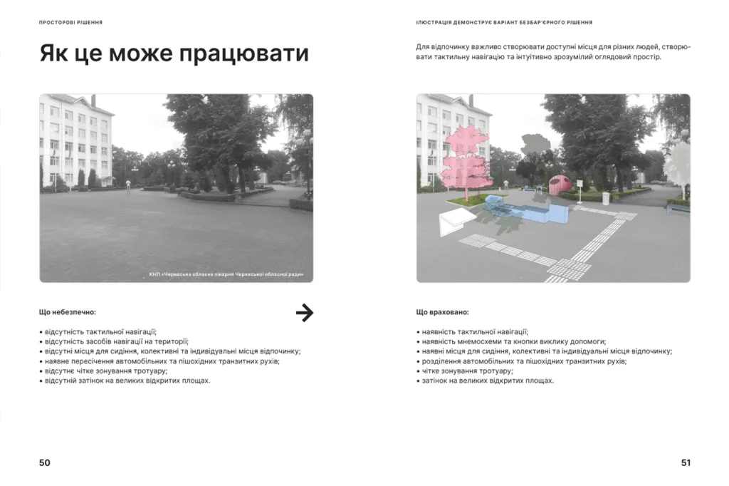 У посібнику автори зібрали практики, підходи й рішення, щоб зробити простори лікарень доступними для всіх — зокрема, для лікарів, терапевтів, відвідувачів і пацієнтів. Посібник містить: