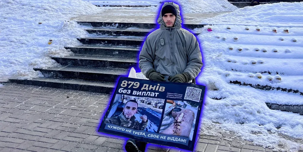 Харківський ветеран Дмитро Олійник 879 днів не отримує законні виплати від військової частини. Через це він вийшов на одиночний протест у центрі Києва.