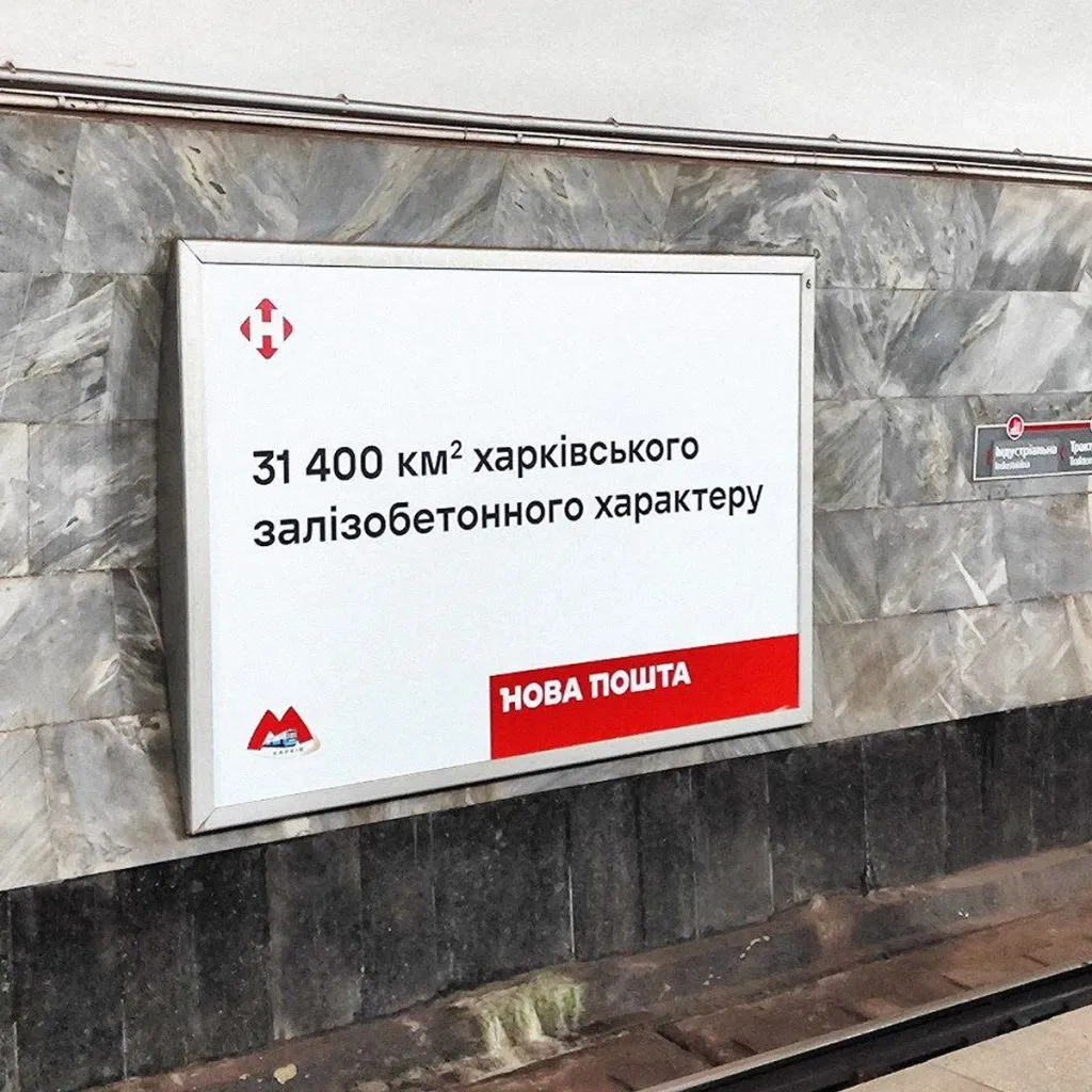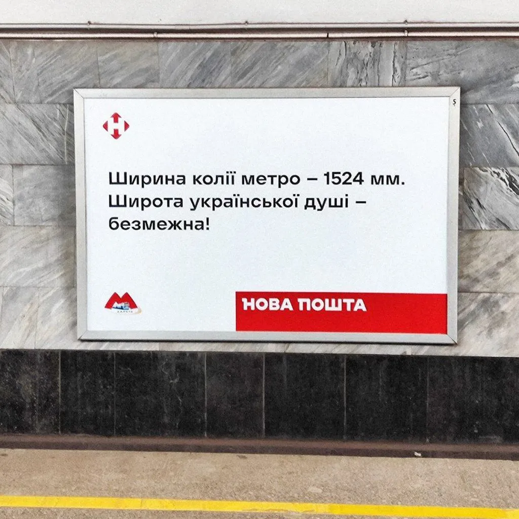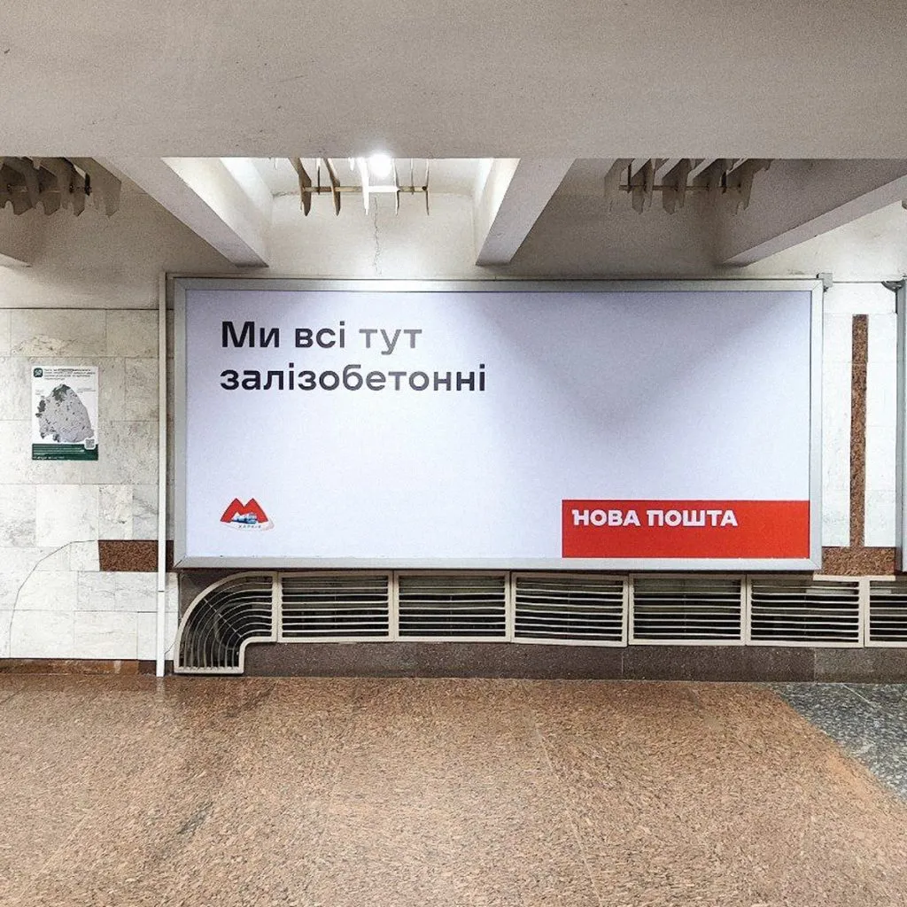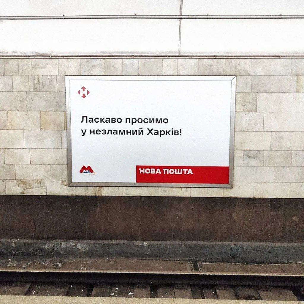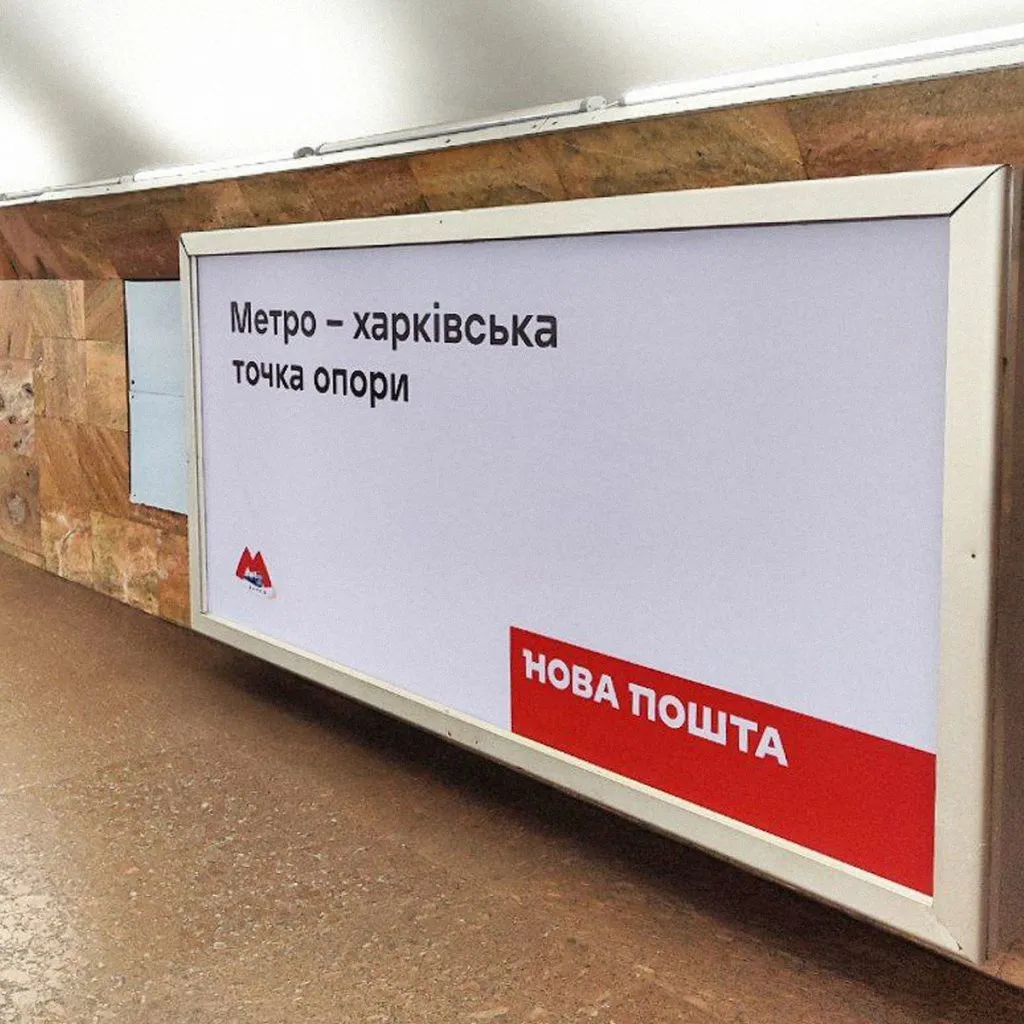 На початку березня на станціях Київського метрополітену з’явилося близько двох десятків повідомлень від «Нової пошти», що мотивують українців підтримувати один одного та вірити у перемогу. У квітні схожі плакати з’явилися й у харківському метро.
