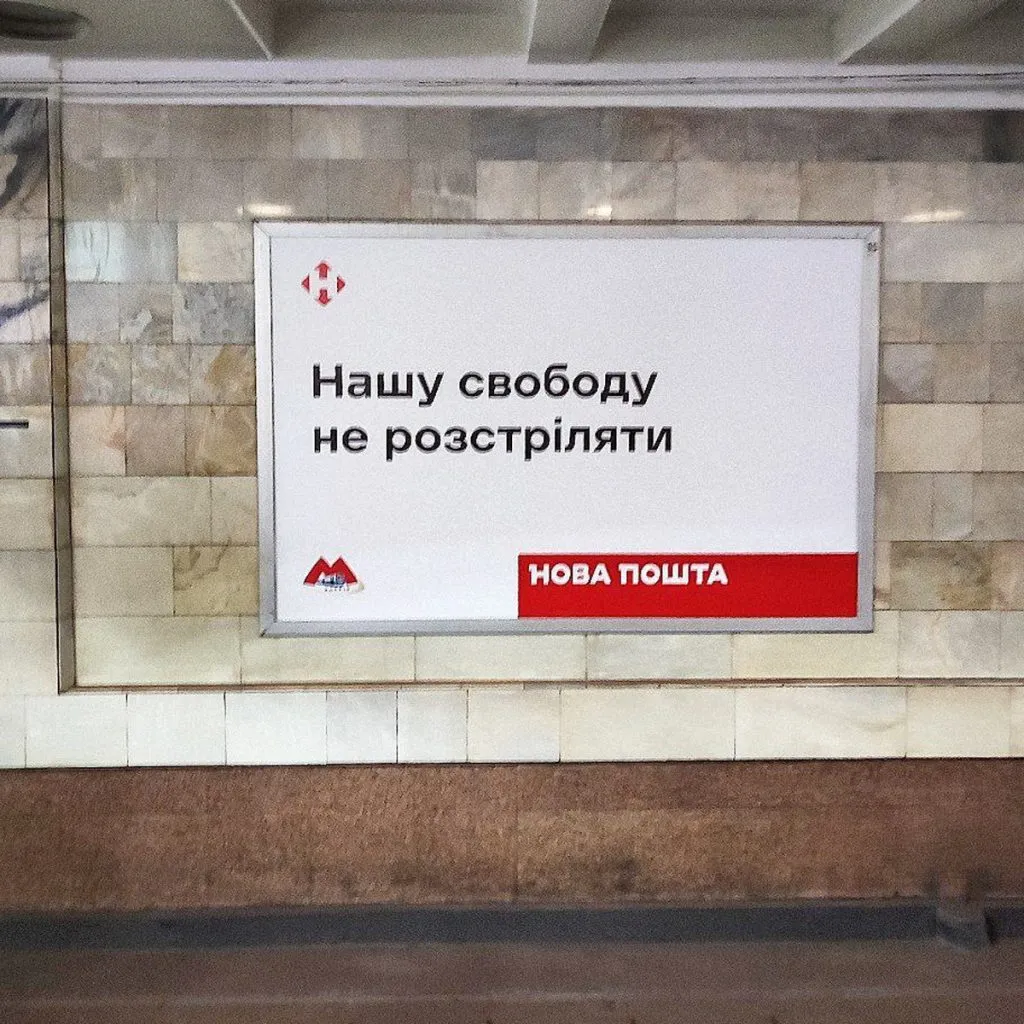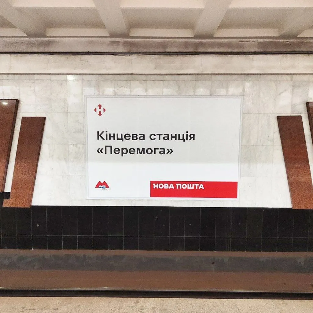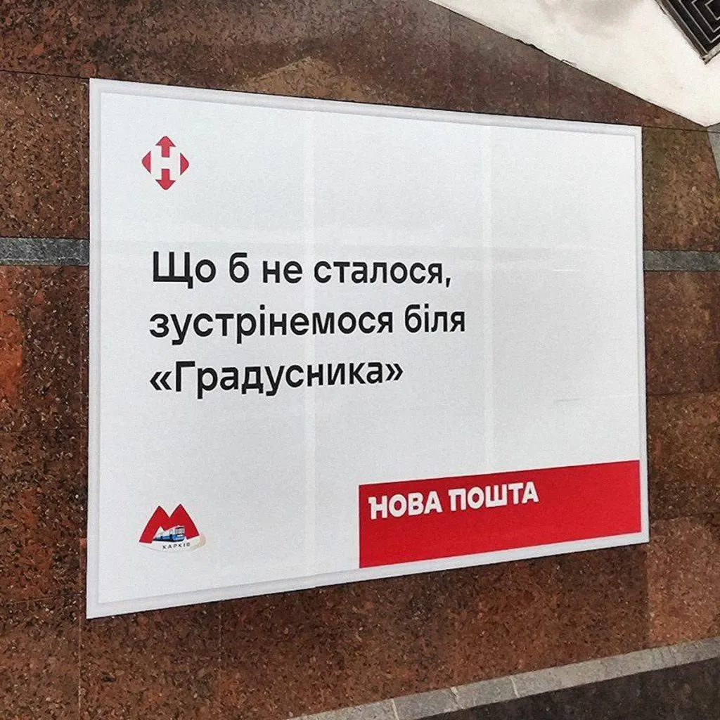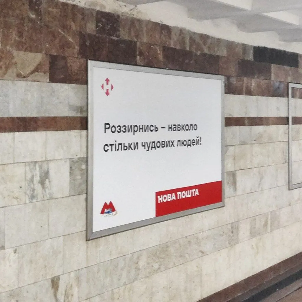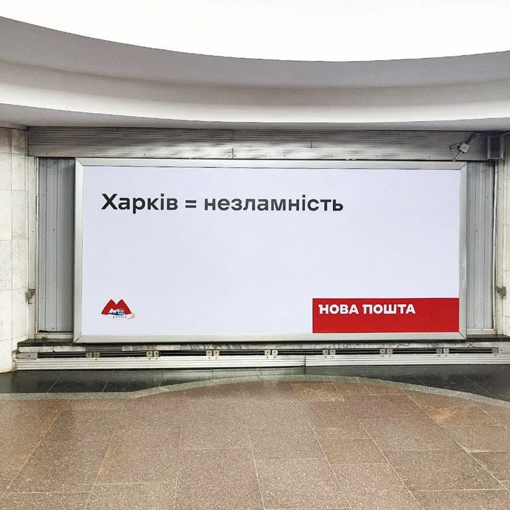 На початку березня на станціях Київського метрополітену з’явилося близько двох десятків повідомлень від «Нової пошти», що мотивують українців підтримувати один одного та вірити у перемогу. У квітні схожі плакати з’явилися й у харківському метро.