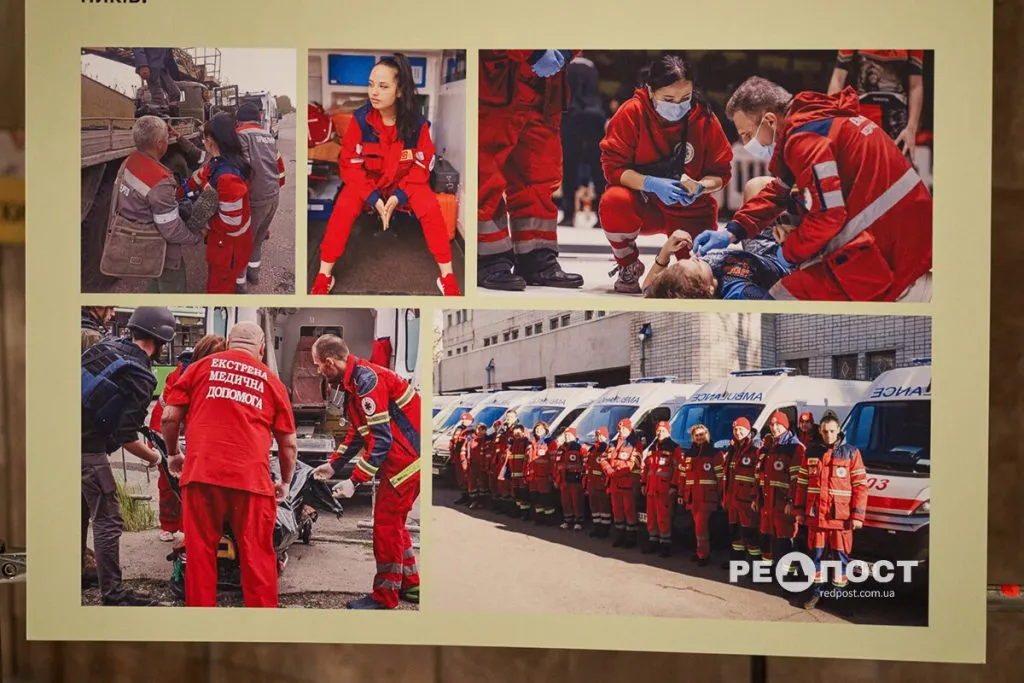 На експозиції представлені фото людей, які щодня працюють для захисту та відбудови міста — військових, медиків, волонтерів, рятувальників та представників творчих професій, зокрема: