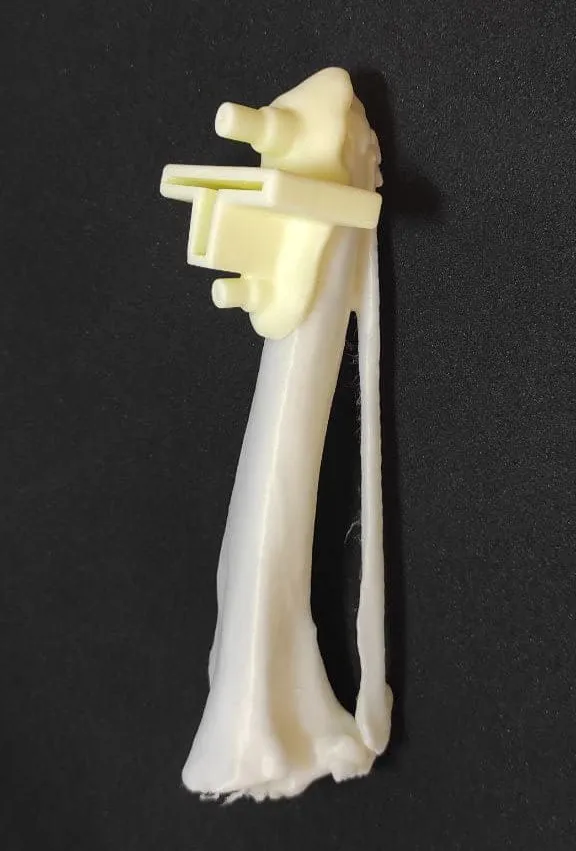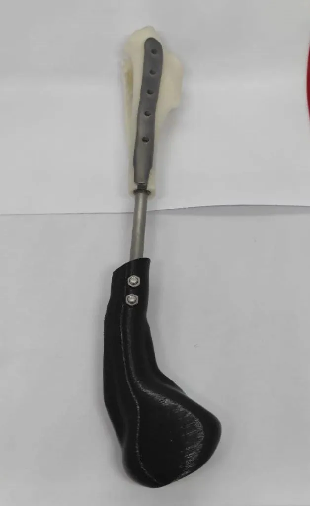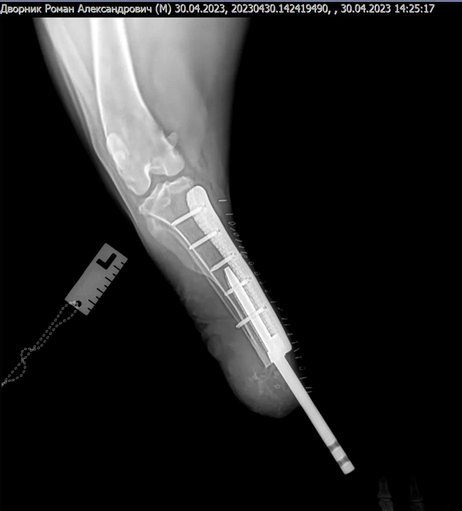 Спочатку собаку лікували в Києві, тому до харківських ветеринарів він потрапив уже із зашитими ранами. Сам імплант встановили на базі Салтівської ветеринарної клініки. Протез розробила українська компанія 3D Metal Tech, що виготовляє хірургічні імпланти із титанового сплаву методом 3D-друку.