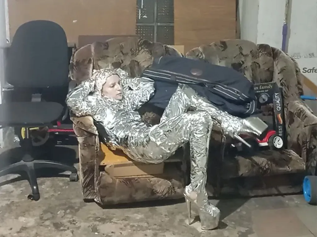 Ще одна робота присвячена вразливості тіла в контексті війни. В ній Марго вдягається в костюм із фольги і гуляє Троєщиною.