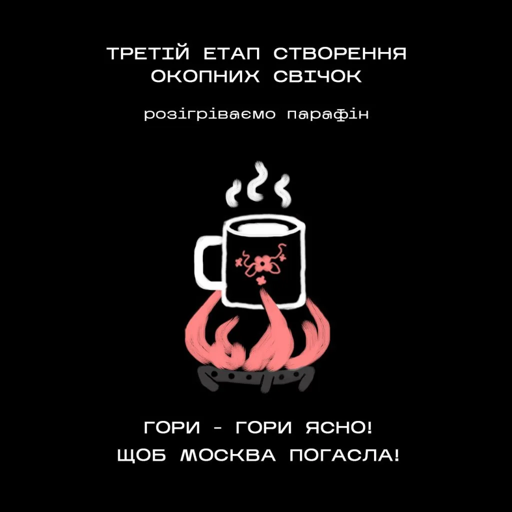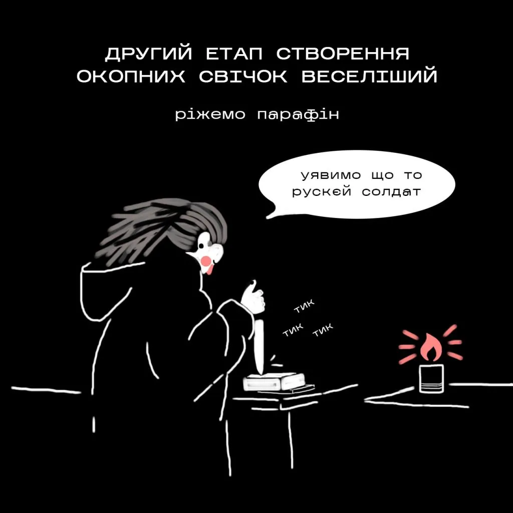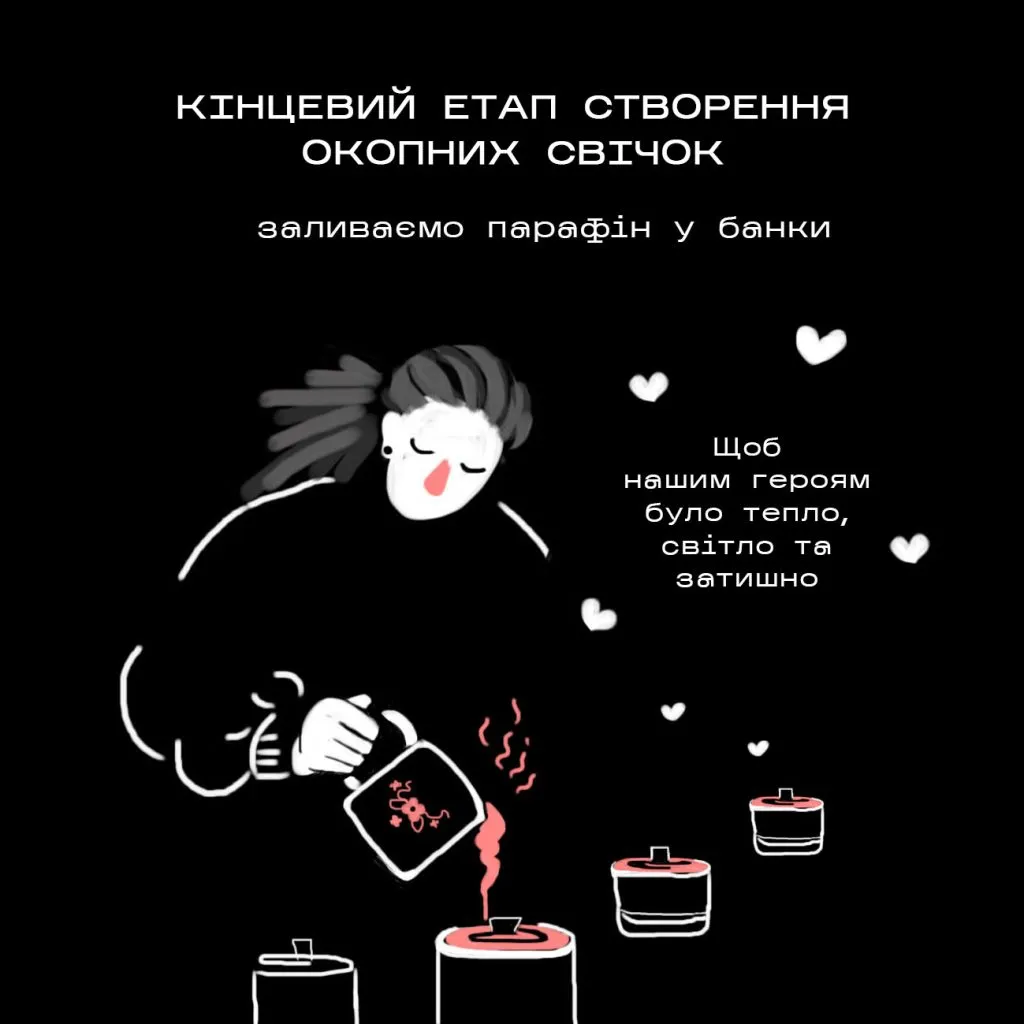 «В останній блекаут я зробила ілюстрований квіз “Яка ти свічка”, — пояснює Лорі. — Та згадала, що в мене є подруга Настя Бджола, яка робить окопні свічки. І запропонувала візуалізувати її працю. Настя була в захваті від тієї ініціативи і ось у нас є короткий ілюстрований сторітелінг про процес виготовлення окопних свічок».
