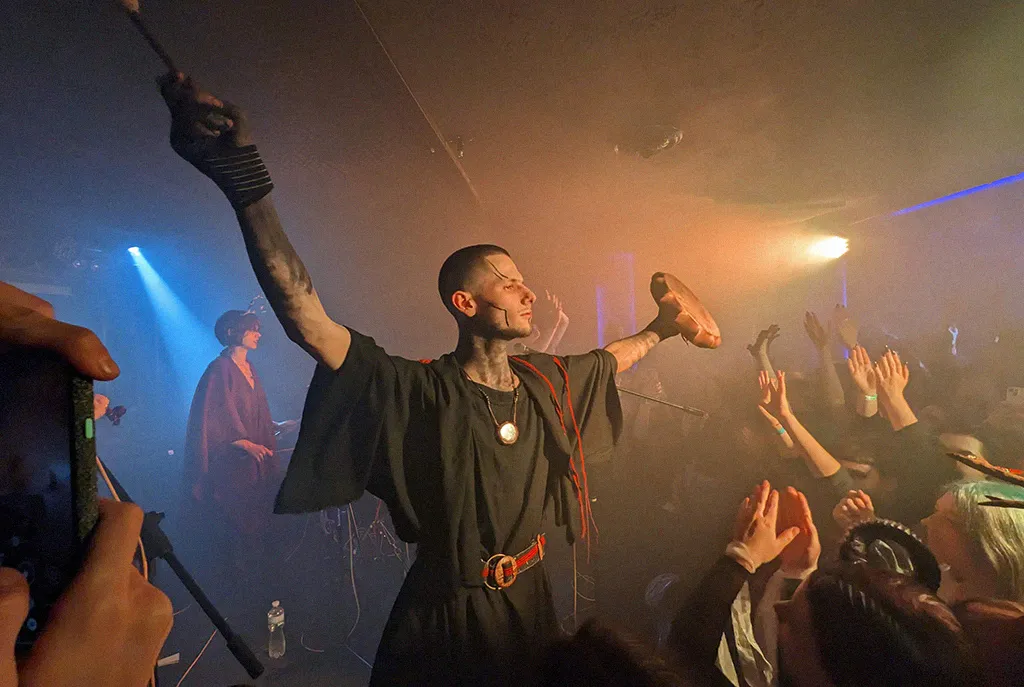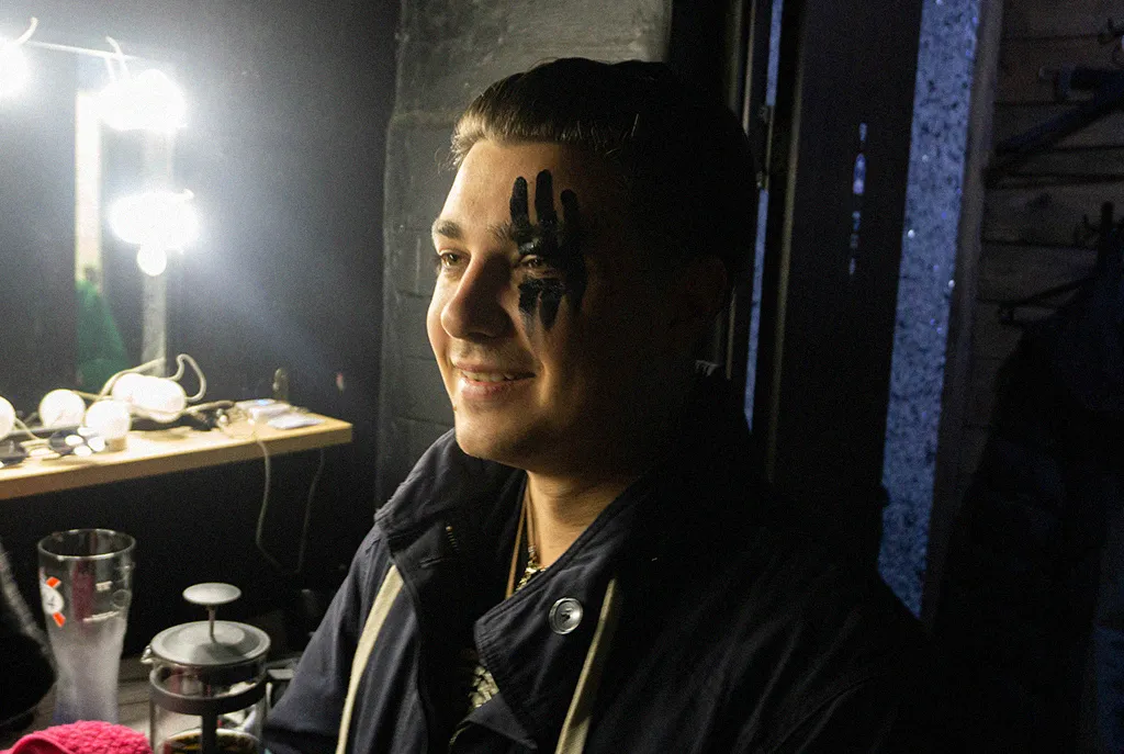 Птиця: Дійсно, у нас був момент там на літньому майданчику. Ми сформували тоді концепцію нашого виступу так, що в першій його частині ми були в одному вбранні, а під час антракту переодягалися і фарбувались приблизно як зараз. І тоді вийшла з рогами до слухачів, і ми крутили хороводи.